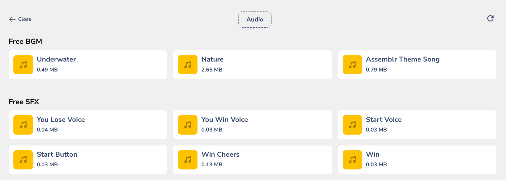 In Assemblr Studio, you can insert two different audio types: **BGM (background music) and SFX (sound effects)**. For the SFX one, it's also a part of the [Sound Effect Interactivity](https://guide.assemblrworld.com/assemblr-studio-editor/interactivity-feature/media-video-control-and-sound-effect).