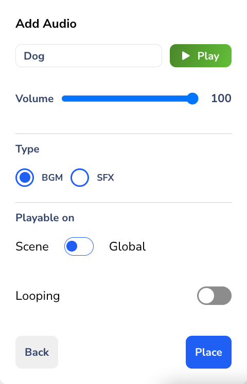 Once you add the audio, you can do further settings for your BGM or SFX—be it **volume adjustment**, where the audio will be played (BGM only), and **looping options**.
