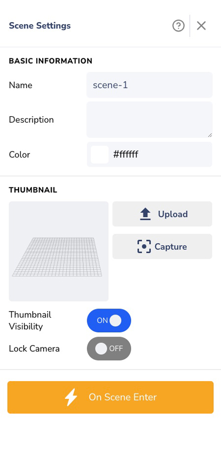 In this panel, you can edit the name of your scene, add some description, change the scene's background color, upload your scene's thumbnail, adding interactivity or even hide the thumbnail.