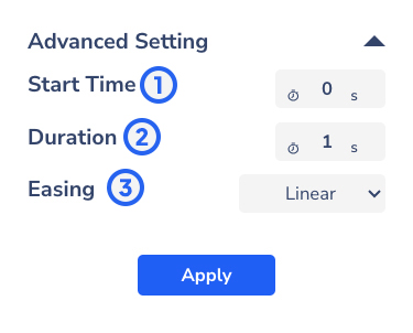 Setiap interactivity juga dilengkapi dengan ***advanced settings***. Kamu bisa atur ***start time*** (waktu mulai), ***duration*** (durasi), serta ***easing*** dari masing-masing *interactivity*; kecuali untuk opsi **Open URL**.